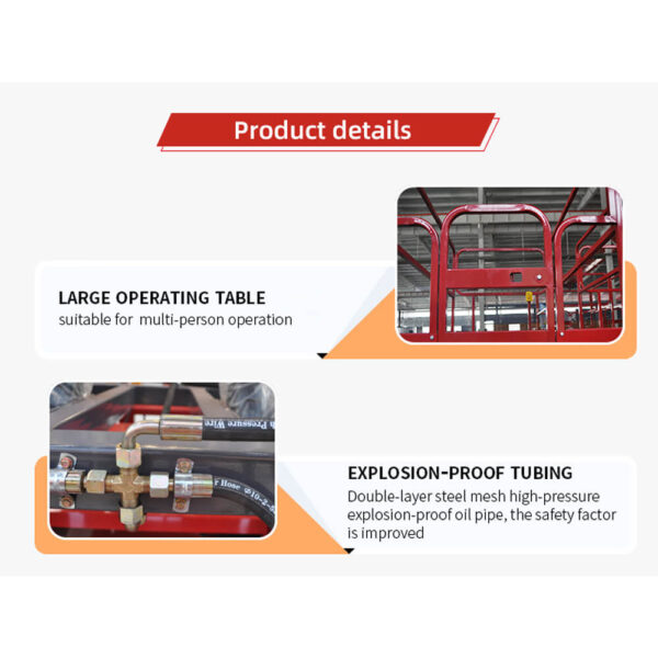 ●Proportional controls ●Self-lock gate on platform ●Drivable at full height ●Automatic brakes system ●Emergency stop button ●Tubing explosion-proof system ●Emergency lowering system ●Onboard diagnostic system ●Tilt sensor with alarm ●All motion alarm ●Horn ●Safety brackets ●Forklift pockets ●Folding guardrails ●Extendable platform ●Charger protection ●Flashing beacon ●Automatic pothole protection