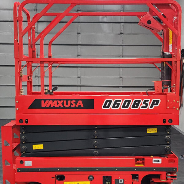 MAXUSA Wheel Crawler Scissor Lift SJV0608SP. The 19-foot scissor lift is one of the medium platform heights, accommodating up to 2 workers, and is suitable for construction sites, large warehouses, production lines, and other tight working environments at medium heights to improve efficiency and is equipped with safe operating systems such as an emergency stop button, explosion-proof tubing, tilt protection, and troubleshooting to enhance safety.